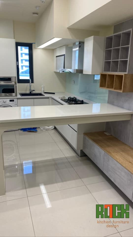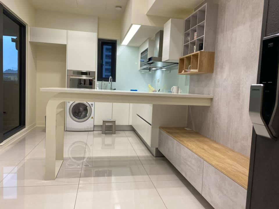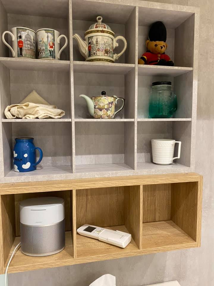 系統櫃設計以「實用與美感並重」為出發點,規劃270度雙開門轉角衣櫃,靈活運用每一寸空間;同時於廚房設計專屬馬克杯收納架,兼具展示與實用功能。整體線條俐落,色調溫潤,打造出兼具機能與舒適感的居家氛圍。